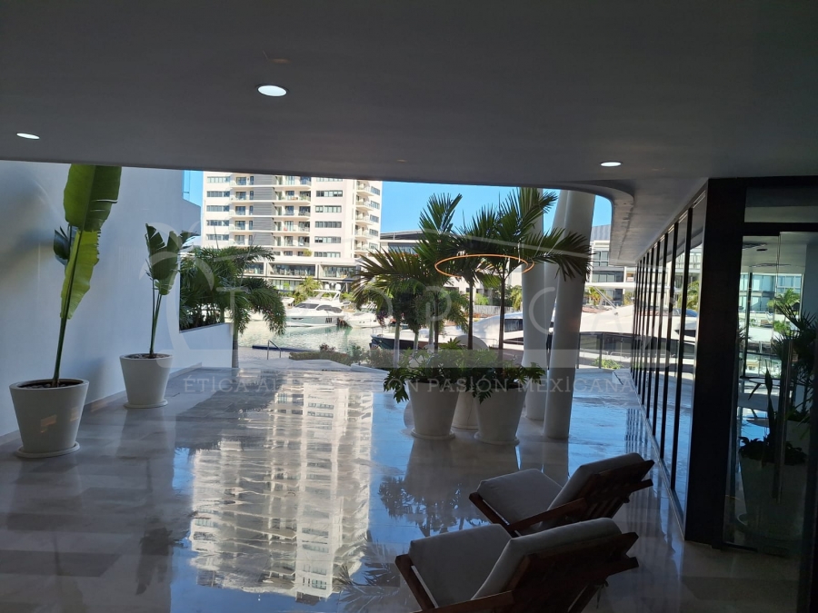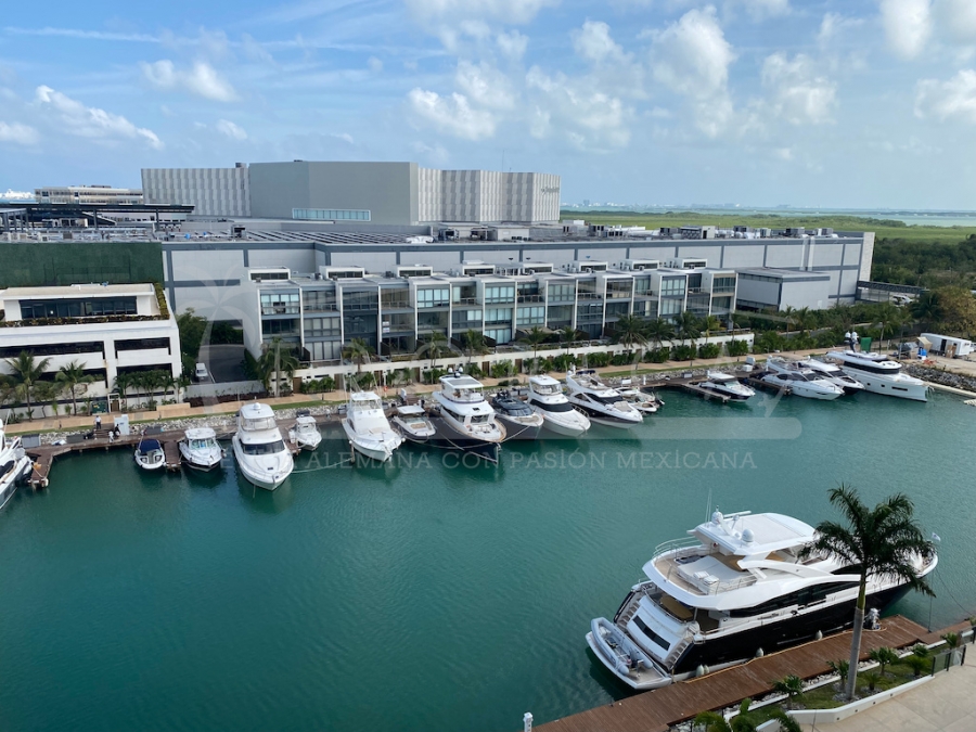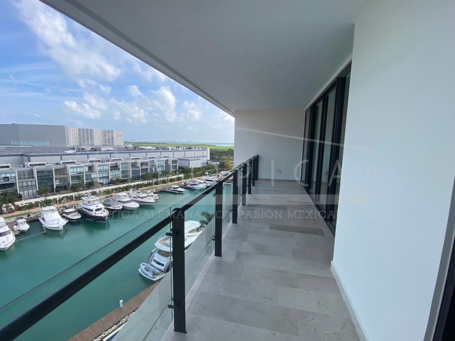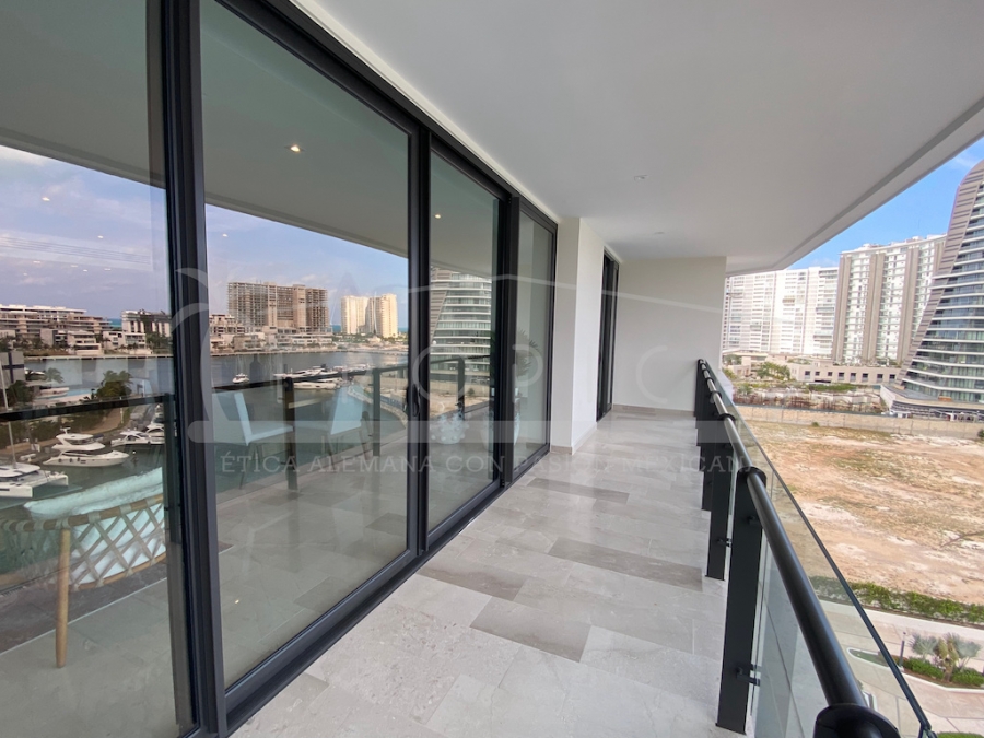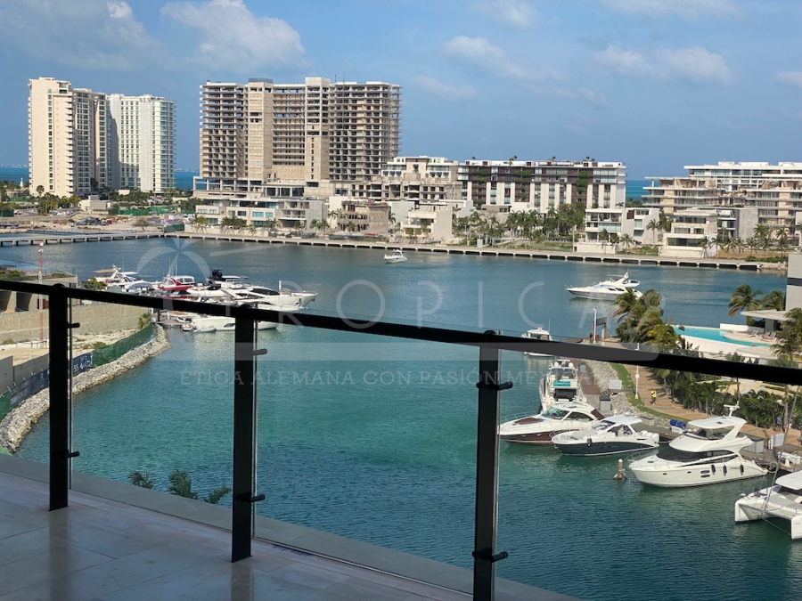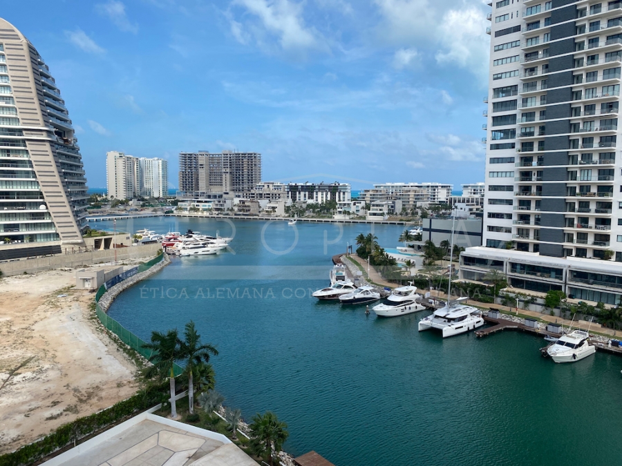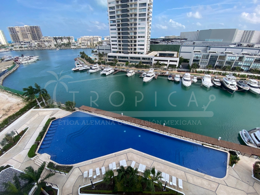 3 recamaras, sala, comedor, TV, cuarto de servicio y una espectacular terraza para gozar los ratos libres en la brisa de un piso 6 con vistas sobre el mar caribe, la marina y los canales de PUERTO CANCUN.