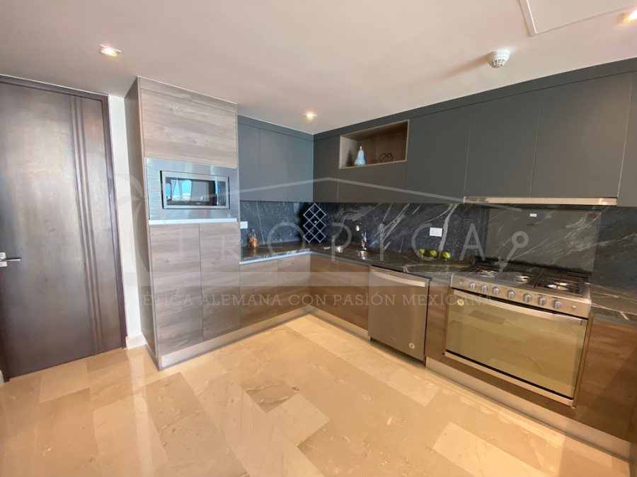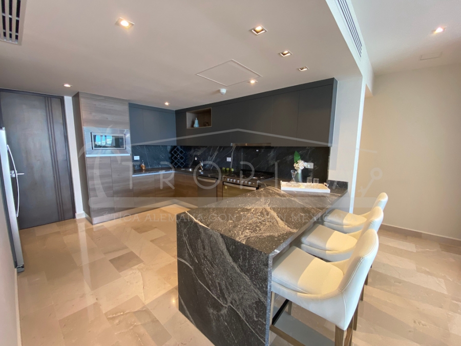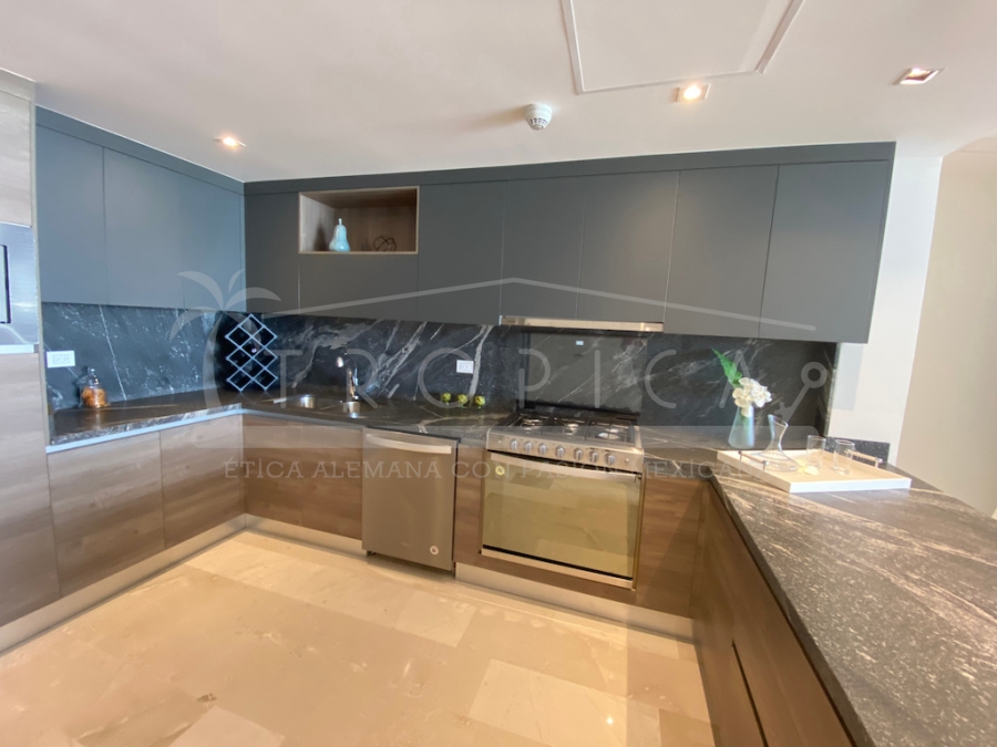 El departamento ofrece 238 m2 con cocina integral y equipada con meseta de granito exótico, refrigerador, estufa, lava vajillas, horno de microondas, campana.