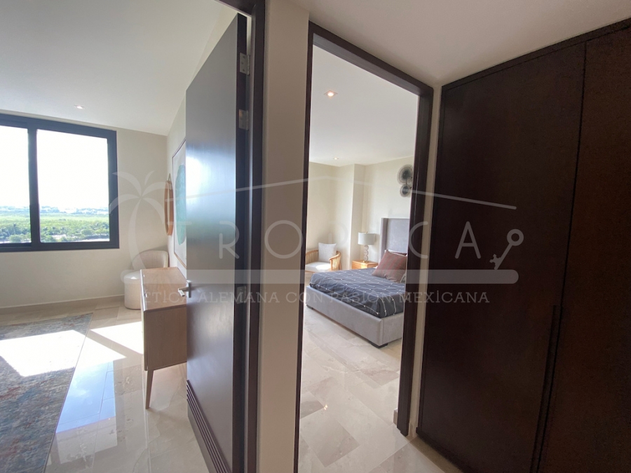El departamento en RESIDENCIAL BLUMEofrece espectaculares vistas sobre el mar y los canales de PUERTO CANCUN desde la recamara principal, la cocina, el comedor y la sala. Las dos recamaras adicionales gozan de una vista sobre el campo de golf deseñado por el campeón múltiple Tom Weisskopf.