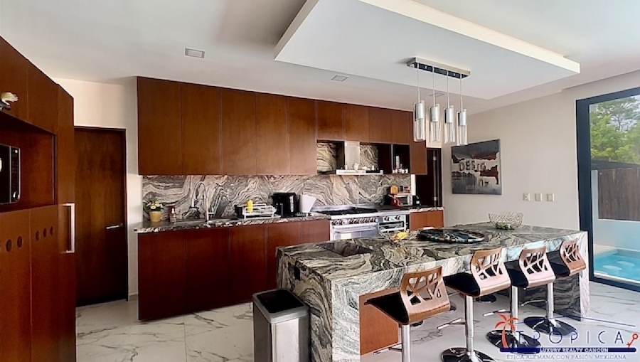Atravesando la planta baja por el interior tendrás acceso a una alberca, wet bar, asador, y un área verde de 485m2 que colinda con el amplio comedor hacia un ambiente lleno de paz y rodeado de una majestuosa flora y fauna.