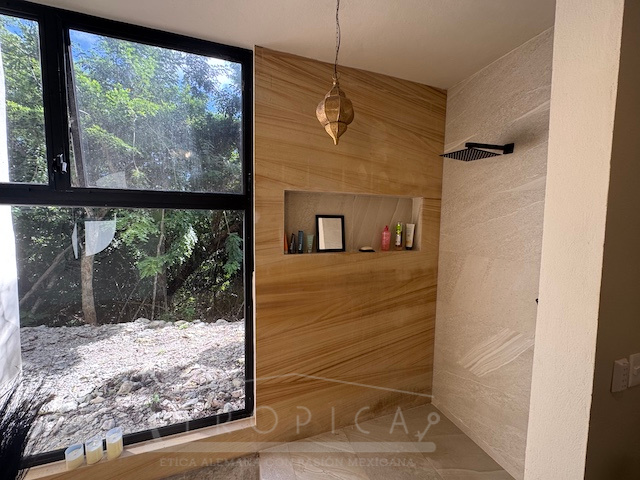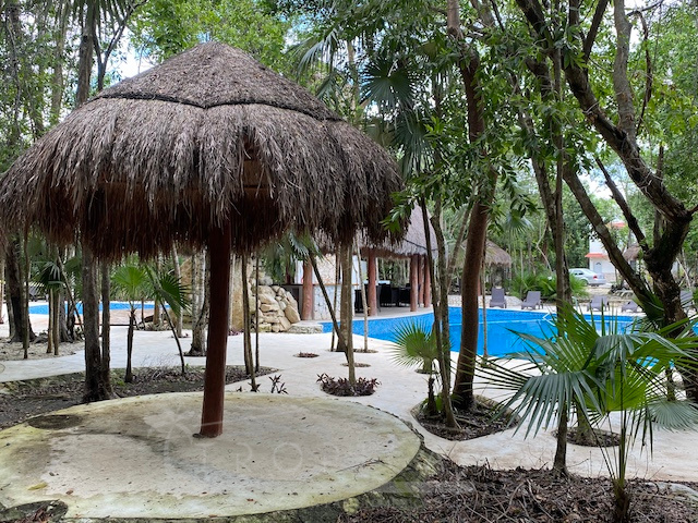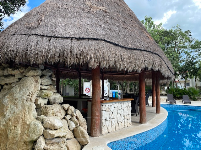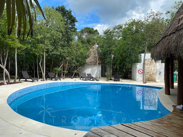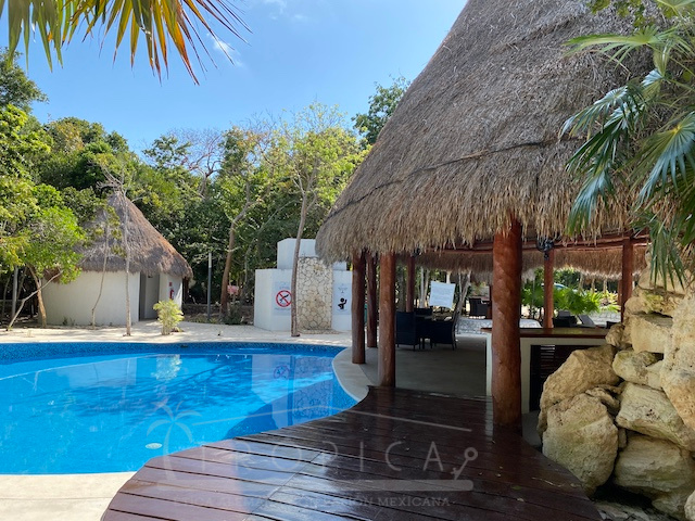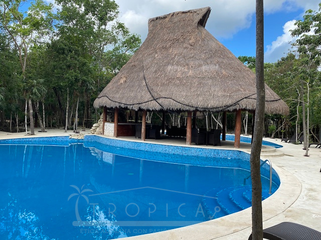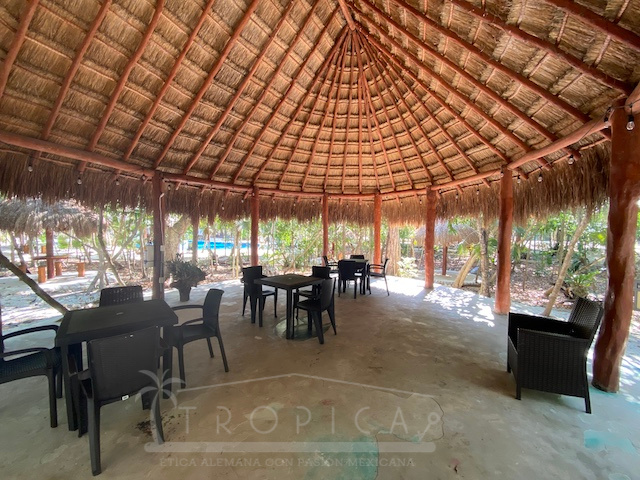 La casa está a solo unos pasos del área común con alberca, solárium, árboles frondosos y una hermosa palapa para disfrutar en solitario o para entretener a familiares y amigos.