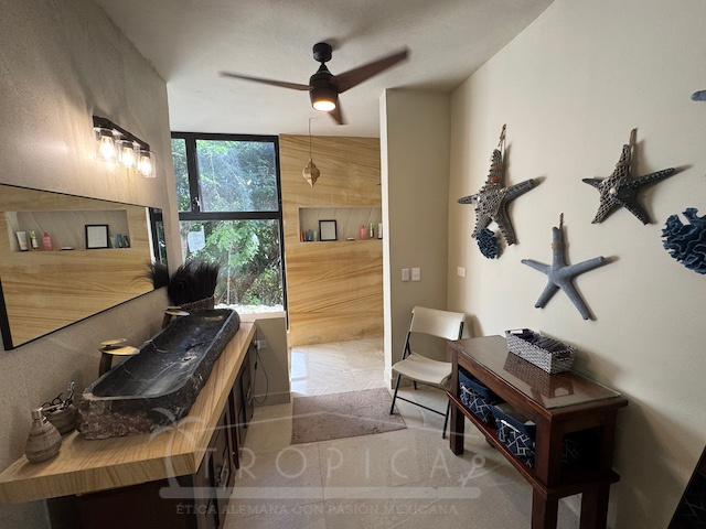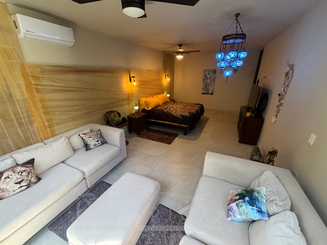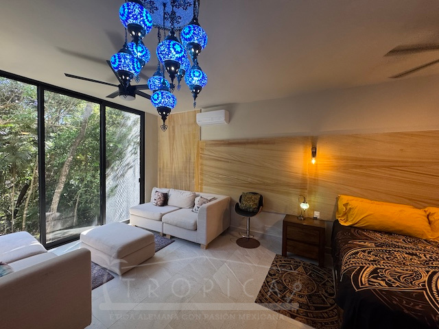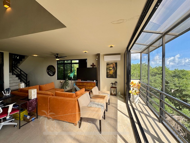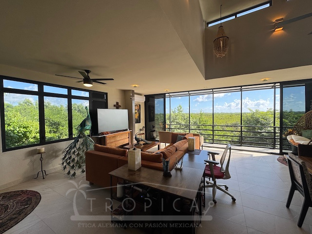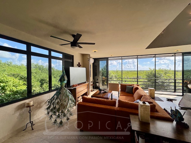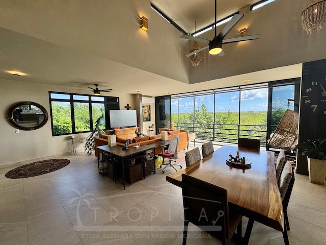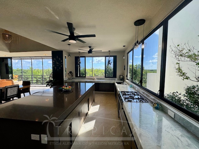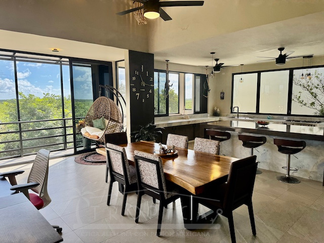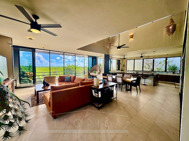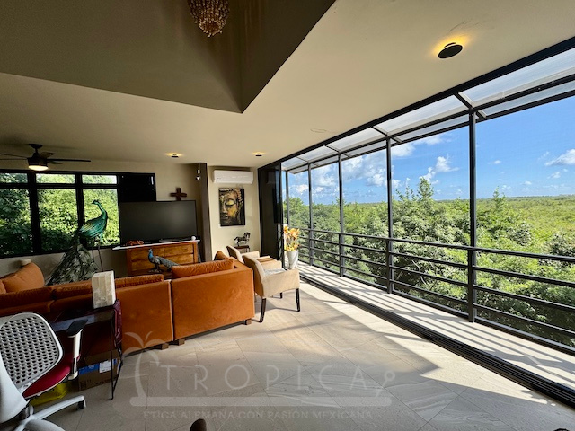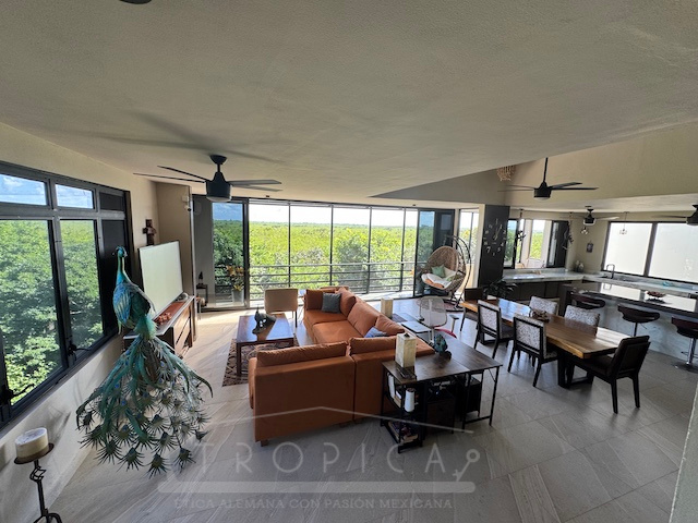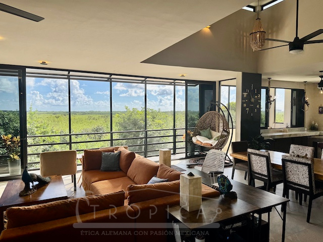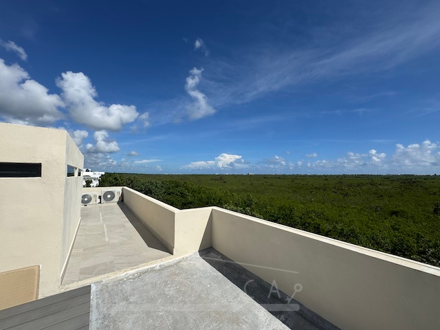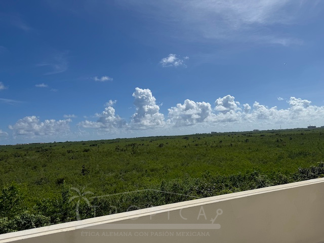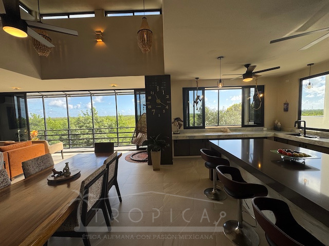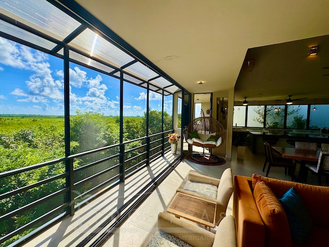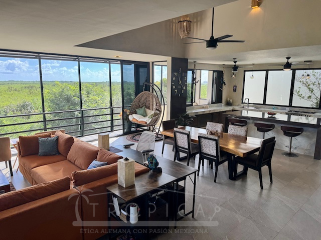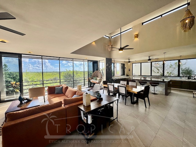 La estancia principal de concepto abierto en el piso superior con sala y cocina y la exclusiva terraza en la azotea con vistas panorámicas inigualables te permiten contemplar sobre kilómetros y kilómetros de manglar hasta la zona hotelera de Puerto Morelos.