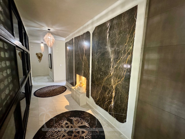 – Todas las encimeras son de mármol excepto la isla de cocina marrón que está hecha de cuarzo