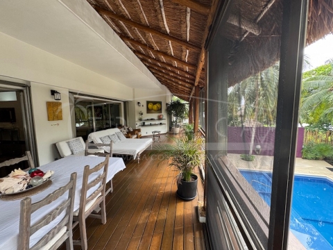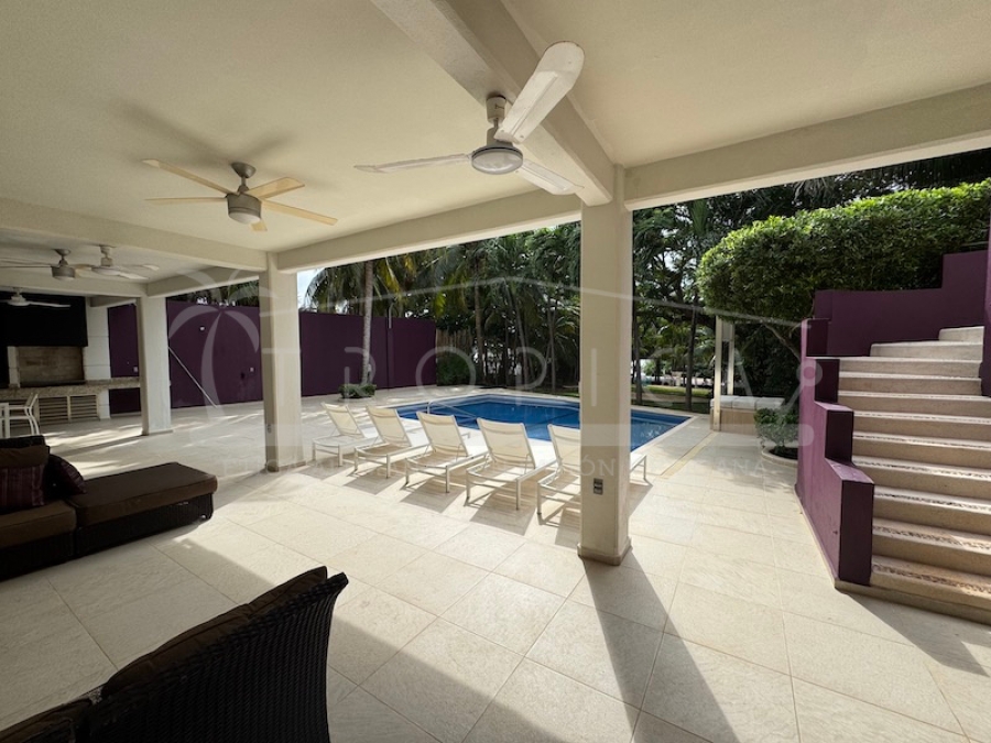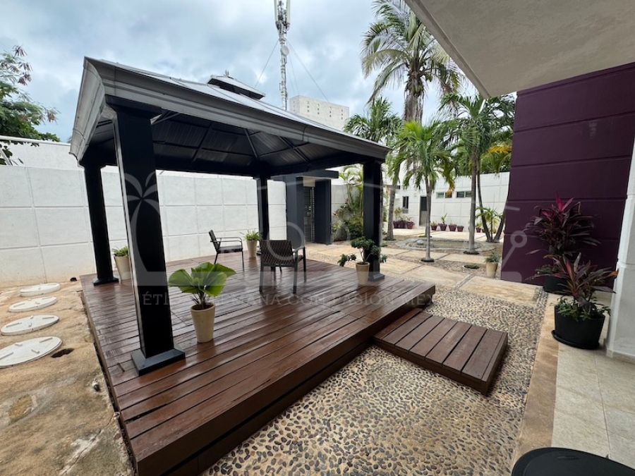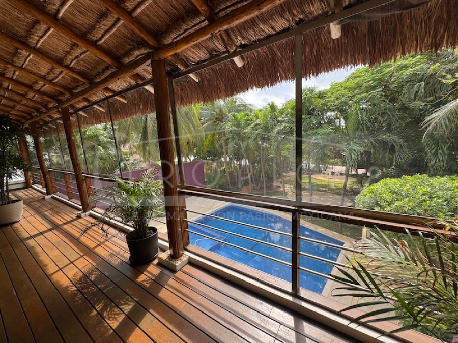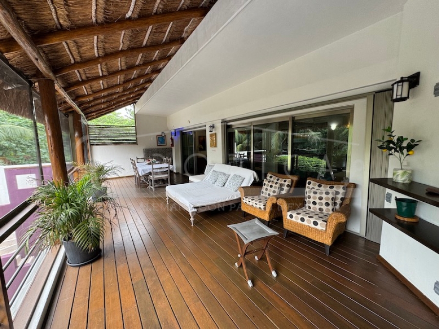 El exterior es simplemente único: Una extensa y amplia terraza en el primer piso con un hermoso piso de madera de zapote, habilitada con un comedor, camastros para el descanso a cualquier hora del día con vistas sobre la piscina y el magnífico jardín.